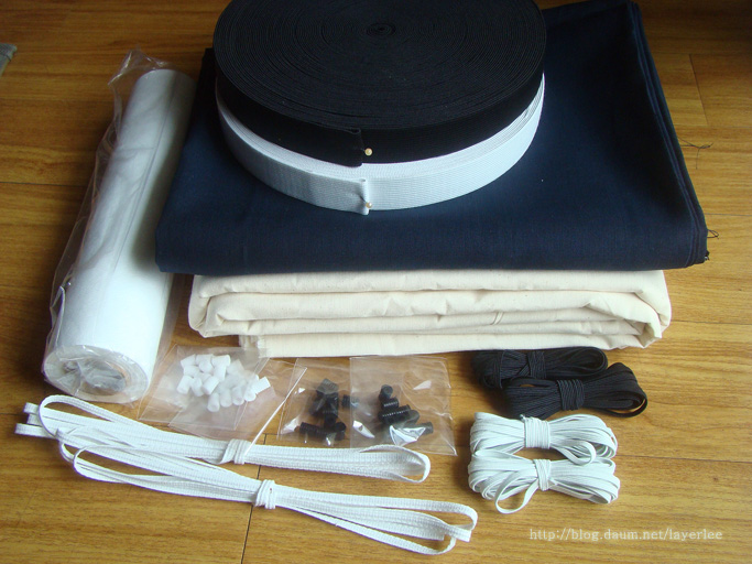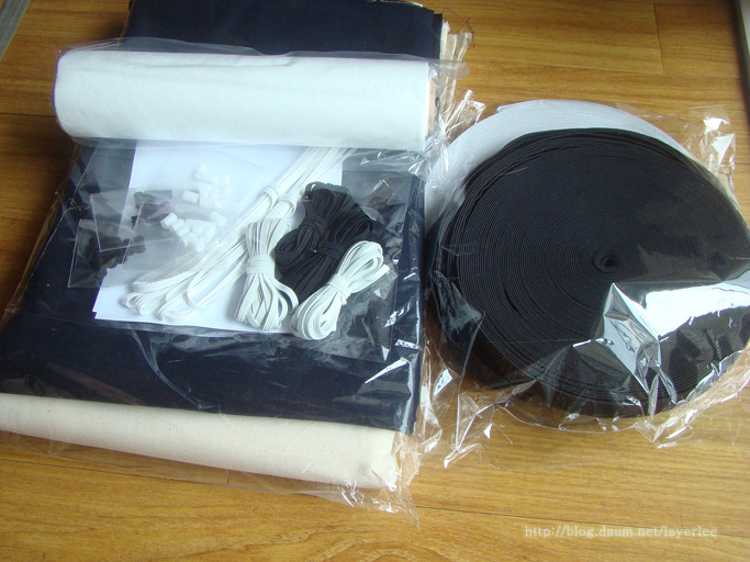 검정색과 흰색 고무밴드 한 롤씩, 그 아래에 딥네이비 색상의 린넨과 20수 생지 면 원단이 뒤쪽에 있습니다.