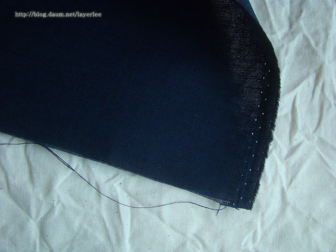근접샷입니다. 딥네이비 색의 린넨 원단은 이렇게 얇아서 살짝 비쳐요. 표면은 까실하지 않고 매끈한 편이에요.