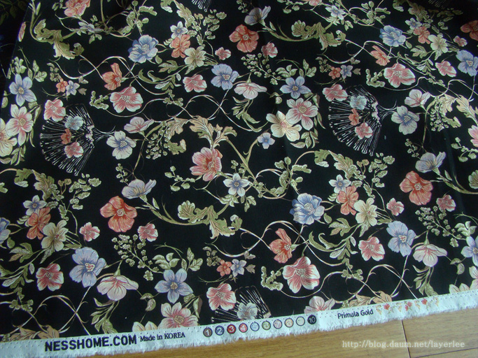원단 설명에도 금빛을 얘기하지만 사진상으로 봐도 금박은 없어 보였는데 실물을 확인해 보니 금빛 느낌이 나게 노란 계열의 선을 많이 사용한 거였어요.