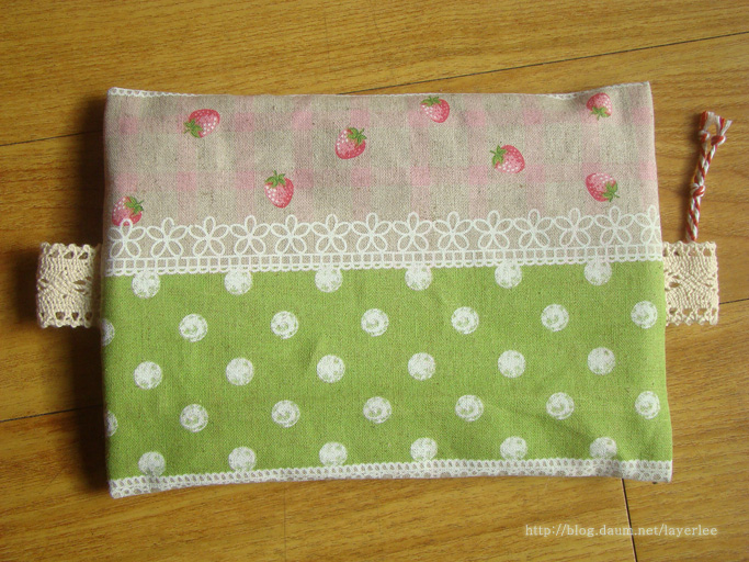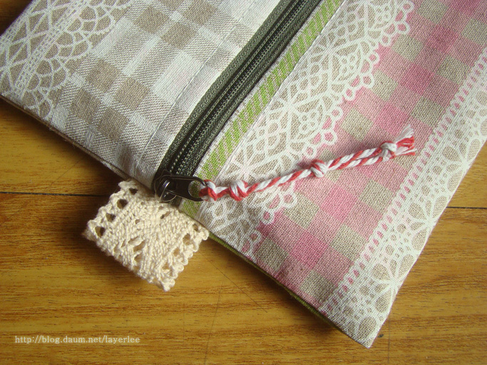 지퍼 고리엔 면 트와인을 매듭 지어서 달아주고 양끝에는 레이스로 손잡이를 달아줬어요.