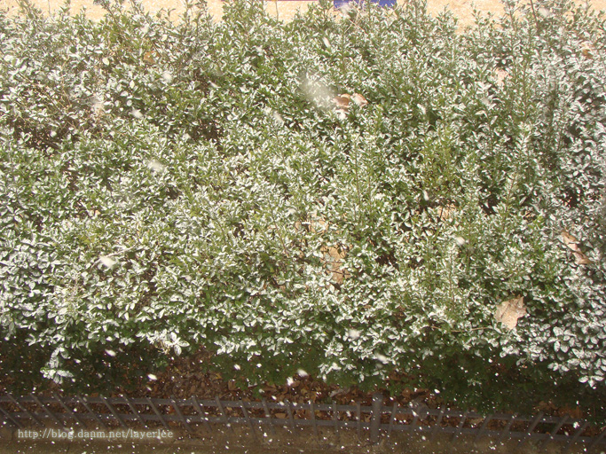 마지막으로 사진 촬영하려고 베란다 문을 여니 눈이 펑펑 내리고 있어 찍은 아래쪽 화단 사진이에요.