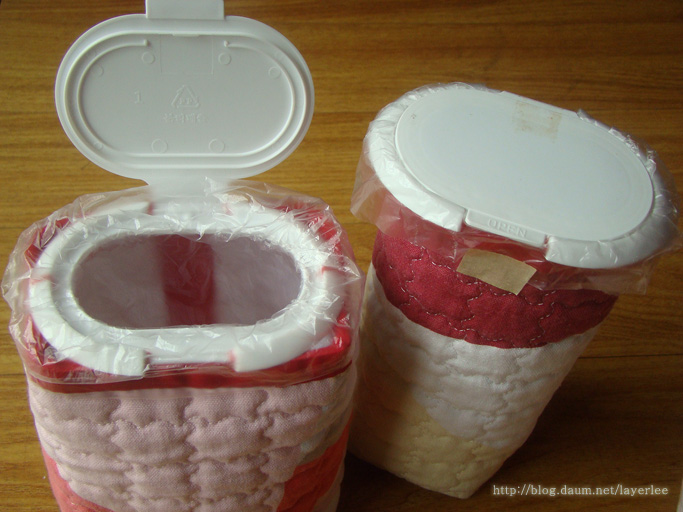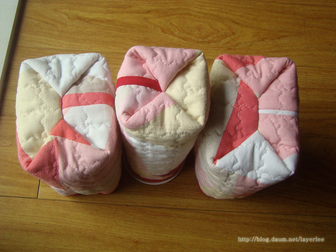 미니 패브릭 바스켓을 만들었어요.소소한 바느질/소품 2021. 3. 1. 14:38물티슈 캡을 재활용하는 미니 패브릭 바스켓을 만들었습니다. 우리말로 귀엽게 부르자면 뚜껑 달린 쪼꼬미 원단 바구니가 되려나요? 용도는 작은 물건을 담거나 비닐 봉투를 넣어 화장대나 책상 위 머리카락 등을 버리는 휴지통으로 쓸 수 있어요. 이전에도 캡 재활용으로 재봉틀용 바늘집을 만든 적이 있어요. (->'여기') 후에 같은 바늘집을 하나 더 만들었는데 그건 따로 포스팅하지 않았어요. 둘레가 캡 사이즈 내외면 되기 때문에 매트 등을 만들고 남은 자투리 퀼팅 원단으로 충분히 만들 수 있어요. 이전에 만든 매트의 길이를 줄이면서 잘라낸 자투리로 이틀 동안 3개를 만들었습니다. 모두 100% 손바느질 작업이에요. 크기는 가로X세로X높이가 8 X 7 X 17 Cm와 11 X 7 X 14 Cm 가량입니다. 셋을 나란히 두었습니다. 가운데 좁은 것이 처음 만든 것이고 완성 후 마음에 들어 두 개를 더 만들었어요. 가운데 것은 침실 화장대 위에 두고 주운 머리카락 등을 버리는 용도로 쓰고 있어요.  뒷모습입니다. 연결 부분을 어떻게 처리할까 해서 두 가지 방법을 사용해 봤어요. 처음 만든 것은 대충 감침질로 붙인 후 바이어스 테이프를 아플리케하는 방식입니다. 나머지 둘은 면끼리 대고 시접 부위를 감침질 한 후 박음질하고 바이어스를 안쪽에 해주는 방식이에요.  위에서 본 모습이에요. 사용 중인 것은 이전에 마스킹 테이프를 붙였던 자국이 남아 있습니다. 둘레가 캡보다 클 때와 작을 때, 그리고 딱 맞을 때를 다 볼 수 있습니다.  바닥면입니다. 접어서 모양을 만들었어요. 이 역시 뒷면 연결부처럼 감침질과 박음질을 하고 안쪽에 바이어스 처리하였습니다.  뚜껑을 연 모습입니다. 각각의 캡 모양과 둘레에 따라 송곳으로 구멍을 뚫고 바느질해서 고정했어요.  캡이 반투명해 안쪽이 좀 더 밝게 보이는 것으로 안쪽 사진을 찍었습니다. 뒷면과 바닥면 바이어스 처리한 것이 보입니다. 입구 쪽까지 모두 같은 바이어스를 사용했어요.  불투명한 뚜껑을 사용한 이 둘은 휴지통으로 사용합니다. 작은 비닐 봉투를 넣고 밀리지 않게 테이프로 고정해주면 됩니다.  뚜껑 고정 바느질이 잘 보이는 근접샷입니다. 끝매듭을 안에서 짓기 힘들기 때문에 바깥에서 장식처럼 했어요.  거실에서 사용할 둘은 매직테이프를 붙여 용도를 적어두었습니다. 반투명한 뚜껑은 사탕통으로, 안이 보이지 않는 불투명한 뚜껑은 휴지통이 되었어요.  사용재료는 물티슈 캡, 네스홈의 면 옥스포드 퀼팅 원단 그리고 빨간색 10미리 바이어스 테이프입니다. 밤에 문득 생각이 떠올라 작업을 해봤는데 꽤 마음에 들어서 다음 날까지 이틀 간 3개를 만들었어요. 머리카락이나 작은 쓰레기를 버리려고 일어나서 큰 휴지통까지 가는 게 귀찮을 때가 있어 캡에 비닐만 넣어서 사용하거나 사용한 종이컵 등에 담아두거나 했는데 아무래도 외관상 깔끔하지 않아 마음에 들지 않았거든요. 그런데 이렇게 만드니 깔끔하고 귀엽기까지 해서 딱 좋아요. 오래 사용하면 아래로 조금 주저앉겠지만 그 때는 뚜껑 떼고 세탁 후에 다림질하고 다시 달아주면 될 듯합니다. 주의점이라면 쓰레기를 너무 많이 모아서 나중에 캡 입구로 비닐을 빼기 힘들 정도가 되지 않도록 해야 합니다. '소소한 바느질 > 소품' 카테고리의 다른 글린넨 손수건을 만들었어요. (0) 2021.03.19 퀼팅 믹스커피 바스켓을 만들었어요.[사진多] (0) 2021.03.10 휴대용 티슈 케이스를 다량 제작했어요. (0) 2021.02.07 간단한 파우치 겸 휴대용 티슈 케이스를 만들었어요. (0) 2021.01.14 퀼팅 패드를 다량 만들었어요. (0) 2020.09.26