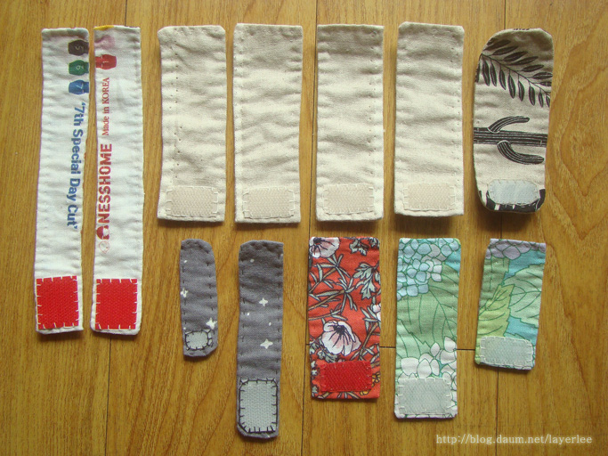벨크로의 까칠한 면 쪽으로 놓았어요. 벨크로 색상은 빨강, 연베이지, 연그레이 색을 사용했습니다.