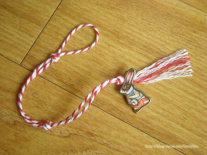 사용재료는 면 트와인 끈과 시계토끼참입니다.