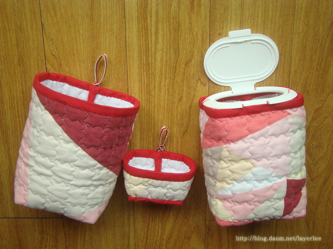 사용재료는 물티슈 캡, 네스홈의 면 옥스포드 퀼팅 원단, 코튼빌의 10미리 레드 라인 린넨 테이프 그리고 빨간색 10미리 바이어스 테이프입니다.