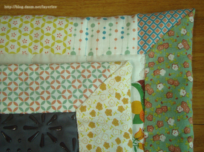 이 역시 퀼팅 원단 뒷면에 가장자리를 먼저 큰 땀으로 홈질해서 고정시켜주고 테두리로 덮었어요.