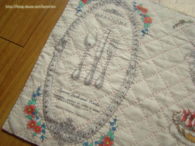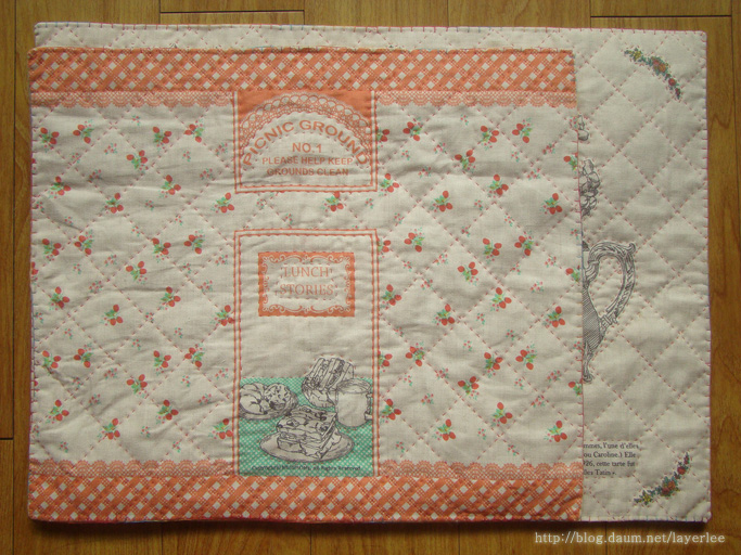 퀼팅선은 그림과 글자의 테두리를 따라 먼저 퀼팅하고 그 안쪽을 피해 전체적으로 정마름모 퀼팅을 했어요.