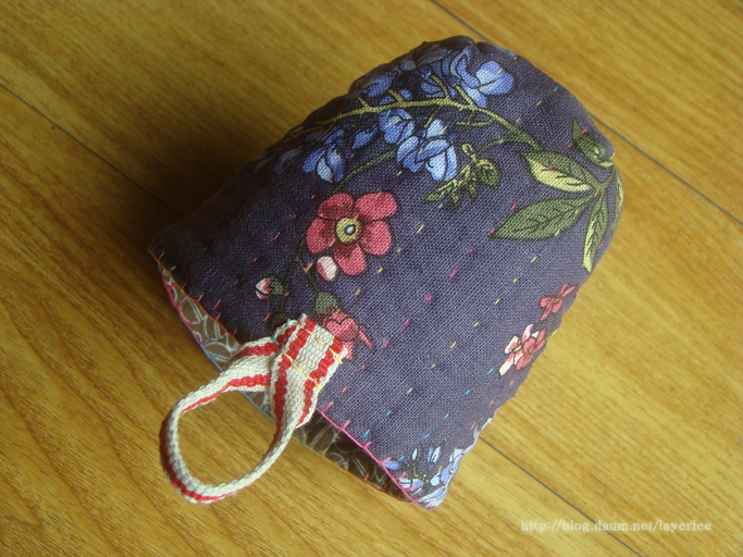 린넨 테이프로 만든 고리끈의 접은 부분과 고정 바느질 그리고 입구의 블링킷 스티치는 30수 3합 무지개사를 사용했어요.