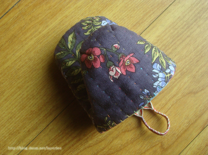 손잡이 파츠는 두께를 위해 7온스 비접착 퀼팅솜을 사용해서 겉면만 퀼팅을 했는데 통퀼팅이 나았을 것 같아요.