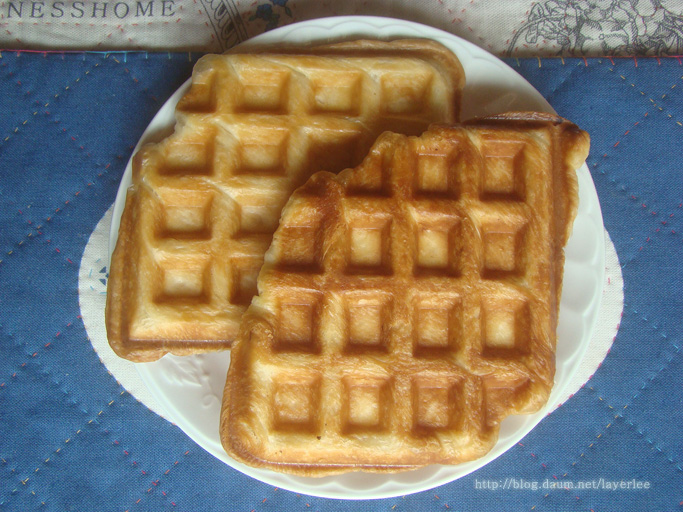 냉장실에서 해동하고 실온 발효 후 오븐에서 부풀어 오르도록 몇 분간 저온으로 돌린 후에 와플팬에 구웠어요.