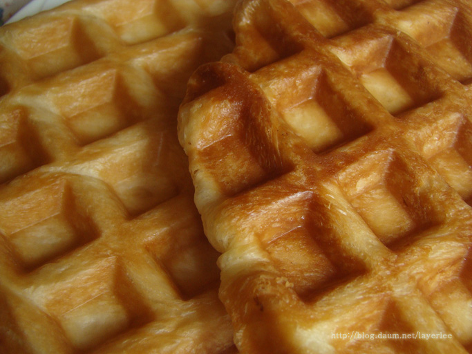 와플 기계에 구워서 나온 완성품입니다. 굽기 전 물을 뿌린 윗면은 조금 밝고 아랫면은 좀 더 색이 진해요.