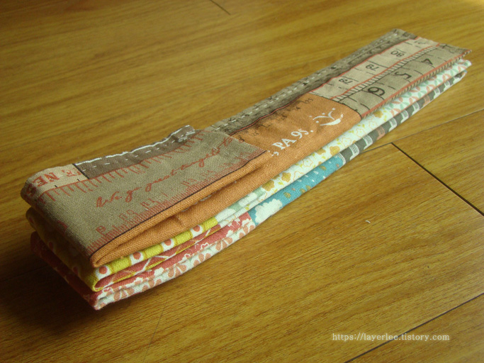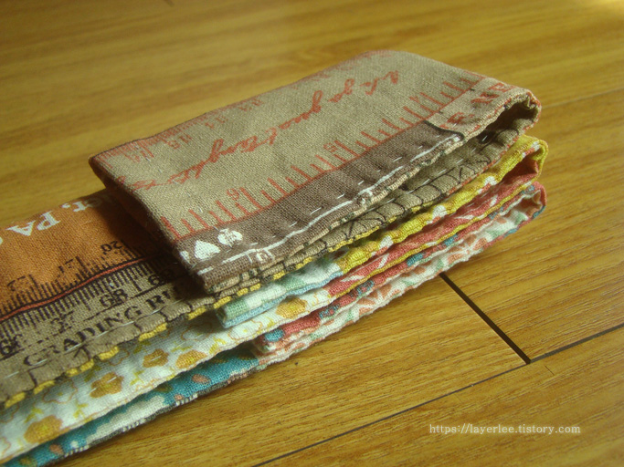 주머니 입구를 두 번 접어 바느질하고 길게 반으로 접은 원단을 ㄱ자 형으로 두 번 바느질해서 쌈솔로 완성하는 간단한 커버입니다.