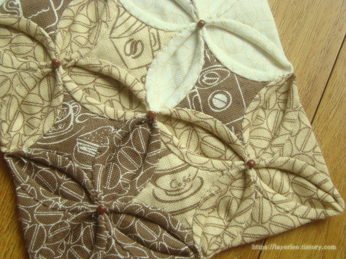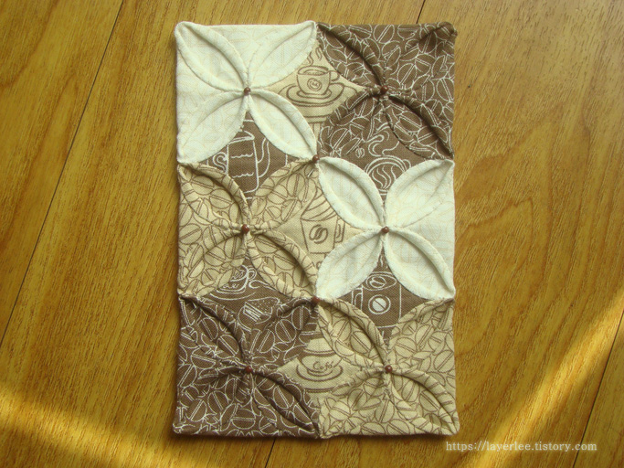 원단은 거실 벽의 체리우드 색에 맞춰 브라운 계열 커피콩 패턴의 모카포트 면 원단을 사용했어요.