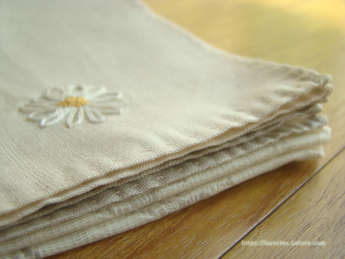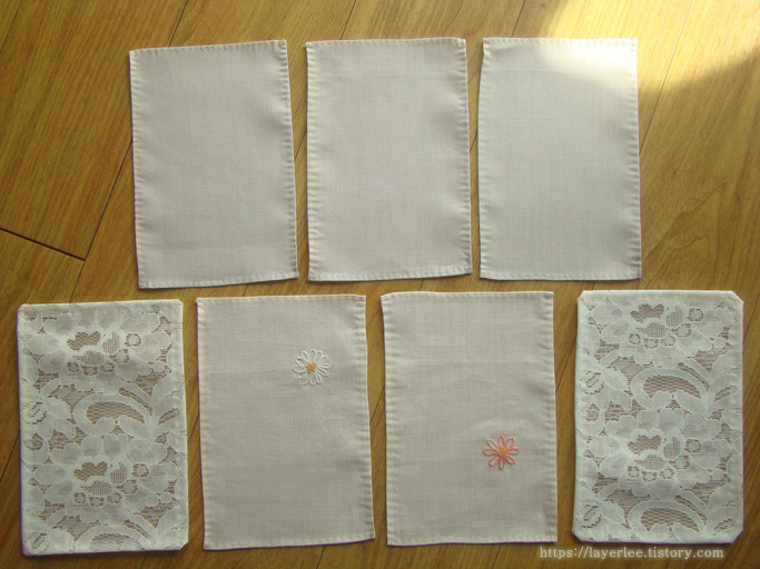 패브릭 스위치 가리개를 만들었어요.소소한 바느질/소품 2022. 10. 11. 16:53앞서 콘센트 가리개 포스팅에서 언급했던 스위치 가리개를 완료했어요. 단순하게 양면 테이프로 고정하는 방식의 패브릭 가리개입니다. 라미(기계 모시) 원단 두 가지와 라미네이팅 코팅이 된 레이스 원단을 사용해 7장을 만들었어요. 크기는 가로세로 10 X 15 Cm 가량입니다. 이번에도 100% 손바느질 작업이에요. 부채꼴로 펼쳐 보았어요. 자수가 놓인 가리개는 2구와 3구 스위치에서 주로 사용하는 스위치의 켜짐 표시예요.  전체를 펼쳐 놓았습니다. 다림질을 했지만 자수틀 자국이 약간 남아 있어요. 라미네이팅 코팅된 가리개 중 하나는 욕실 콘센트용이고 다른 하나는 가스 레인지 옆에 위치한 다용도실 스위치용이에요. 물을 막거나 혹은 가끔 세척이 필요한 위치여서 라미네이트 원단을 선택했습니다.  자수는 프랑스 자수실을 사용했어요. 간단하게 레이지데이지 스티치와 프렌치 너트 스티치 두 가지만으로 만들었습니다. 자수 놓기 전 실에 왁스를 바르고 완성 후 다림질을 했더니 프렌치 너트 부분이 납작해져 버렸어요.  라미 원단의 테두리는 곱솔(깨끼 바느질)을 약식으로 하는 방식을 사용했습니다. 곱솔은 원래 3번 바느질을 해야 하는데 기준선이 되는 첫번째 바느질을 생략하고 송곳으로 선을 긋고 그 선 따라 접은 다음 2번째와 3번째 바느질을 해서 완성했습니다. 그래서 앞면에는 실이 한 줄로, 뒷면에는 두 줄로 보여요. 이것도 처음에는 두 줄의 바느질 선에서 땀을 맞추면서 바느질하기도 했는데 나중에는 귀찮아져서 그냥 하기도 했어요. 라미네이팅 코팅 원단은 올풀림이 없기 때문에 한 번 접어서 바느질하는 것으로 마감했어요.  라미 원단 두 가지는 밝은 베이지색과 P 베이지라고 명명된 색 두 가지를 사용했어요. 왼쪽의 밝은 베이지는 서문시장에서 구입했고 오른쪽의 P 베이지는 온라인 패션스타트에서 구입한 거예요. 살구톤의 베이지와 회색톤의 베이지로 구분할 수 있겠어요.  스택 사진입니다. 약간 펼쳐 보이게 쌓았어요.  그냥 모아서 쌓은 옆모습입니다. 라미 원단 가리개는 모서리 부분이 손바느질 특유의 물결이 나타나요. 모서리는 겹쳐져서 두께가 있다 보니 다림질할 때 덜 다려지고 조금 밀리기 때문에 그런 듯해요.  사용 재료는 라미 모시 원단 베이지와 P 베이지, 라미네이트 코팅 레이스 원단 그리고 프랑스 면 자수실입니다. P베이지의 라미 원단은 다른 라미 원단을 찾다가 발견을 했는데 사놓고는 그 동안 까맣게 잊고 있었어요. 그것도 이게 뭐지?라고 잠시 생각을 하고서야 어떻게 구입하게 되었는지가 떠올랐어요. 예전에는 원단마다 지퍼백에 넣고 네임펜으로 비닐에 종류나 두께 관련 정보를 적어놨기 때문에 '라미'라고 적힌 글을 보고 발견을 했지 안 그랬으면 아마도 더 오랬동안 잊혀져 있었을 거예요. 촬영을 하느라 아직 스위치에 가리개 설치를 못했는데 포스팅 완료하면 돌아다니면서 붙여야겠어요. 사용후기는 특별한 단점이 나타나지 않으면 아마도 없을 듯해요. '소소한 바느질 > 소품' 카테고리의 다른 글패브릭 스위치 가리개를 더 만들었어요. (0) 2022.11.16 괴불 노리개와 복숭아 노리개를 만들었어요. (0) 2022.10.27 성당창문 콘센트 가리개를 만들었어요. (1) 2022.10.08 큐렛 케이스용 조리개 파우치를 만들었어요. (0) 2022.04.07 특별한 용돈 파우치를 만들었어요. (0) 2022.01.12
