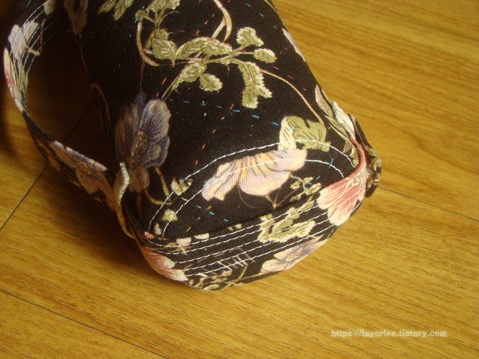 퀼팅은 60수 3합 무지개사를 사용하고 겉감은 검정색 실로 공그르기해서 연결했습니다.