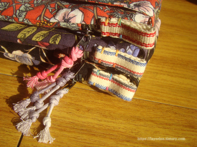 붉은 채송화 린넨을 사용한 가방만 분홍색 그라데이션 면끈을 사용했어요. 나머지 둘은 보라색 그라데이션 면끈입니다.