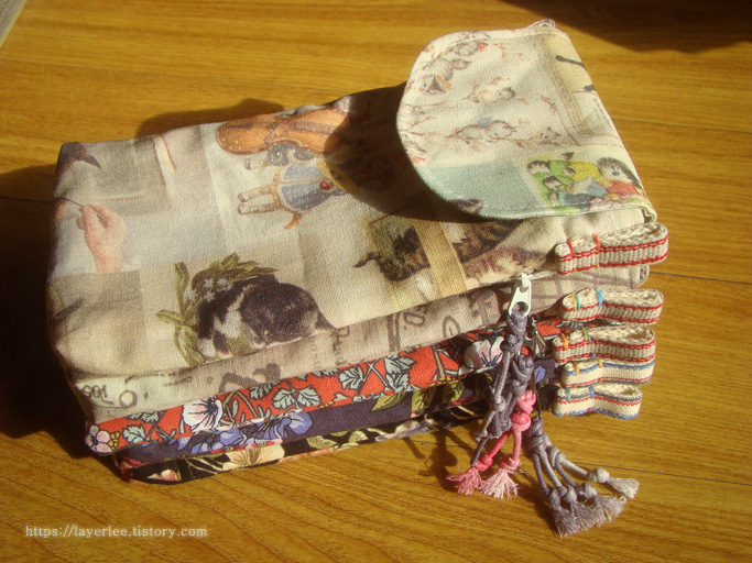 사용재료는 코튼빌의 빈티지캣 린넨, 빈티지 페이퍼 린넨, 면 이중지, 달맞이꽃 면 원단, 미니 코스모스 베이지 면 원단과 10미리 면 웨이빙, 12미리 린넨 테이프, 3호 롤 지퍼 2종, 지퍼 슬라이더 2종, 벨크로 2종 그리고 2미리 그라데이션 면끈 보라색입니다.