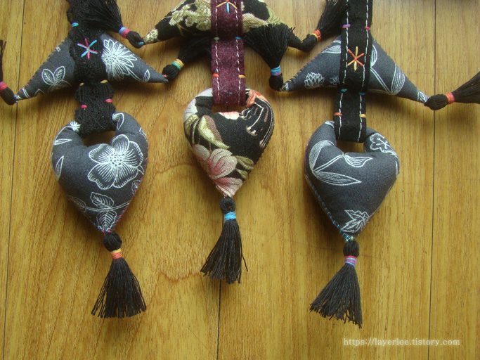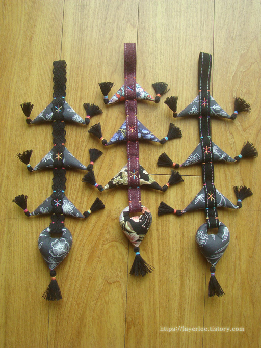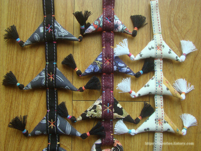 가운데가 3가지 꽃무늬 린넨을 사용한 것이고 좌우가 야생화 면 원단을 사용한 노리개입니다.