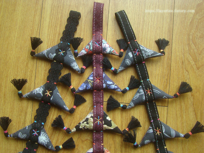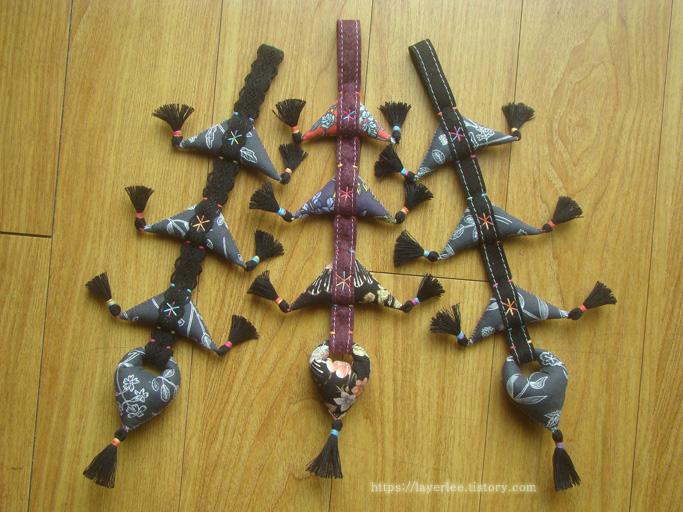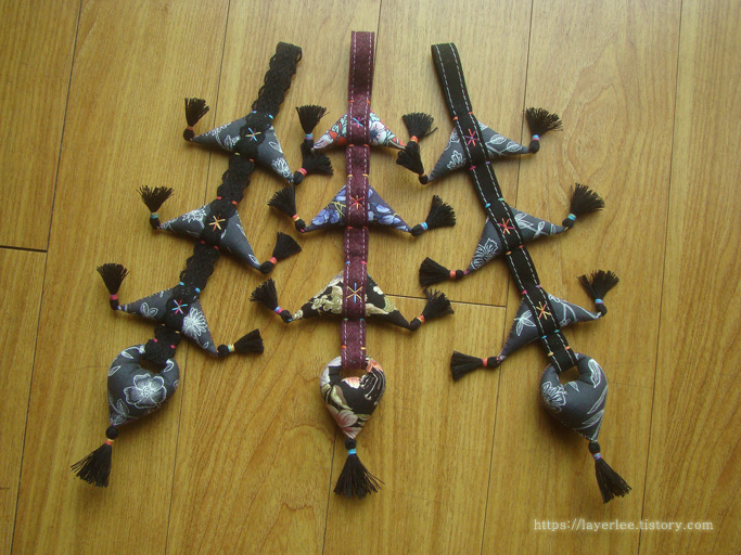 면 원단으로 2개의 노리개를 만들고 린넨 원단 3가지를 조금씩 다른 크기로 잘라 또 다른 하나의 노리개를 만들었어요.