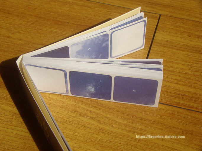 아래 사진처럼 두 개의 스티커가 없더라고요. 앞에서 세번째 장과 뒤에서 네번째 장입니다.