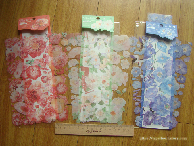 우선 동양풍 꽃 스티커입니다. 후백처리가 없어 반투명한 비닐 재질이에요.
