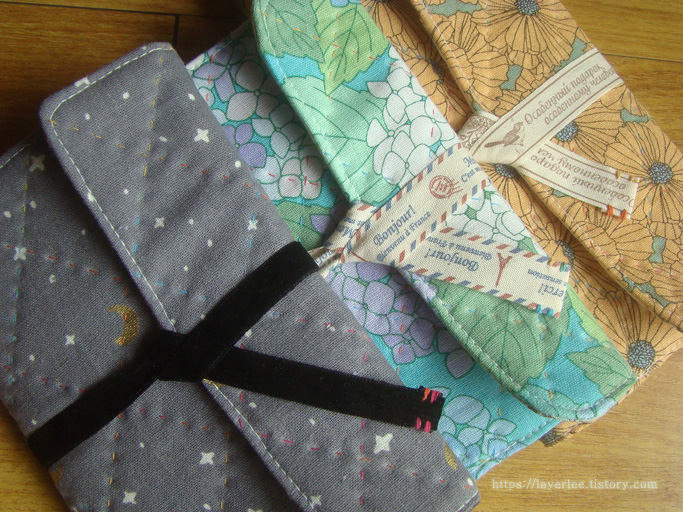 위와 동일한 미니 수첩 사이즈용 커버입니다. 겉감은 별달 린넨을, 여밈끈은 10미리 벨벳 테이프를 사용했어요.