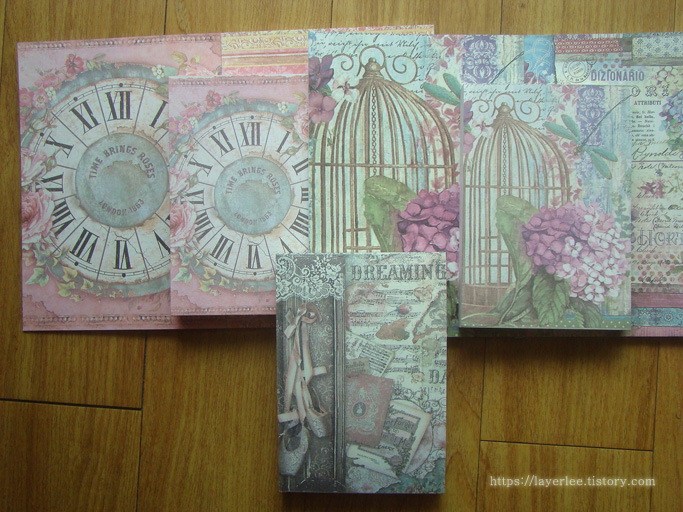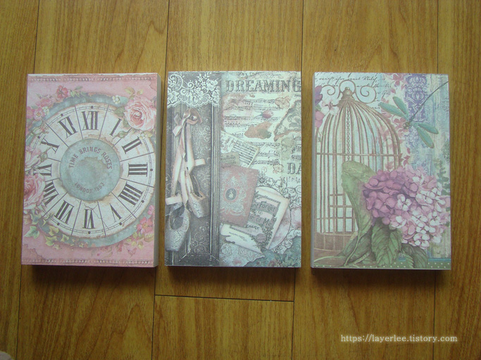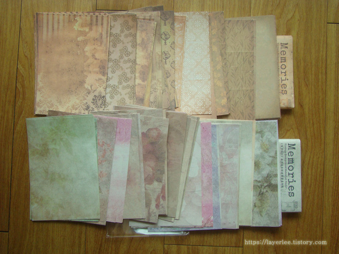 3가지 재질의 종이로 하나는 약간 도톰한 흰색 종이이고 나머지는 얇은데 흰색과 미색 두 가지 바탕지에 두 장씩 구성되어 있더군요.
