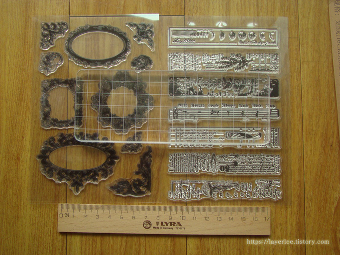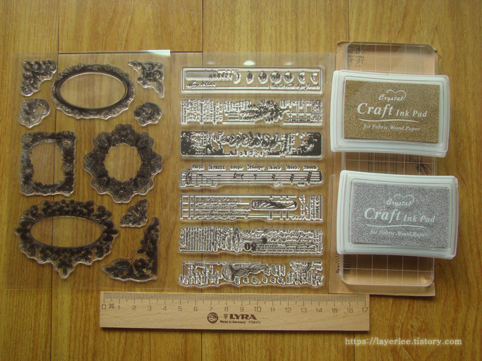 스탬프 관련 용품들입니다. 클리어 스탬프 2가지와 스탬프용 아크릴판 그리고 금은색 잉크 패드입니다.