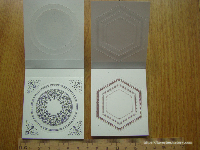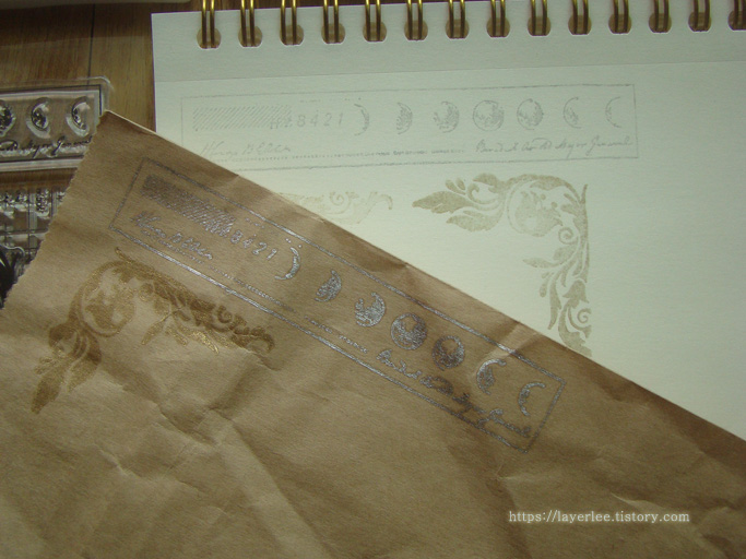 은색으로 와이드 스탬프 중 하나를 그리고 금색으로 테두리 스탬프 중 하나를 두 가지 종이에 찍어봤습니다.