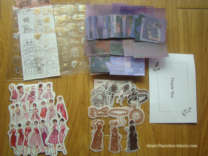 덤 제품 확인이에요. 3디자인 금은색 스티커 6매, 보라색 배경지와 스티커 55매, 분홍색 인물 스티커 20디자인 40매 그리고 앤틱 인물과 장신구 스티커 10디자인 30매입니다.