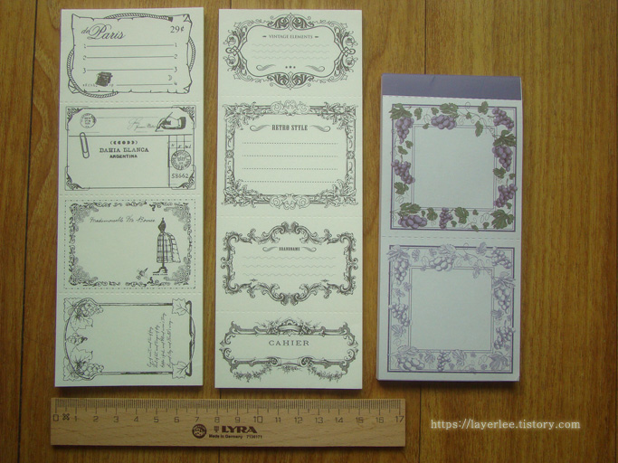 왼쪽 둘은 3가지 종이에 10매씩 총 30매이고 오른쪽은 두 가지 디자인 25매씩 총 50매입니다.
