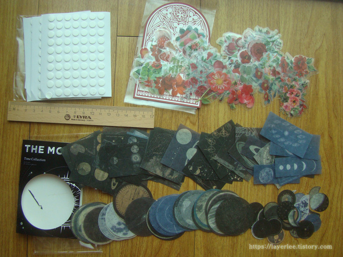 전에 다른 옵션을 구매했던 50패턴 2매씩 총 100매짜리 꽃 스티커의 빨강 옵션 그리고 우주 관련 100매 스티커입니다.