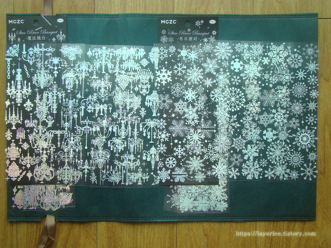 홀로그램박으로 된 샹들리에와 눈꽃송이 스티커는 각 10매로 장수도 많아서 마음도 함께 넉넉해집니다.