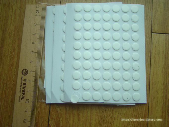 위의 원형 폼 스티커를 좀 더 크게 찍었습니다. 왼쪽 아래에 이형지를 살짝 밀어낸 것이 있는데 투명한 폼이에요.