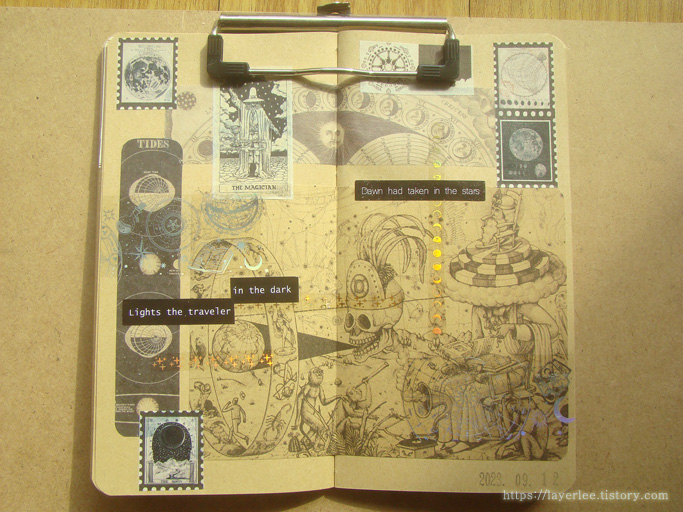 독특한 배경지를 활용한 우주와 신비가 섞인 다꾸입니다. 금박과 은박 홀로그램 테이프를 사용해 반짝반짝해요.