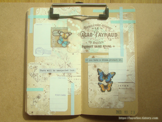 색감이 마음에 들어 고른 다꾸입니다. 배경지와 나비 그리고 마테의 민트와 하늘색이 포인트입니다.