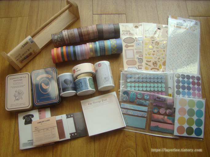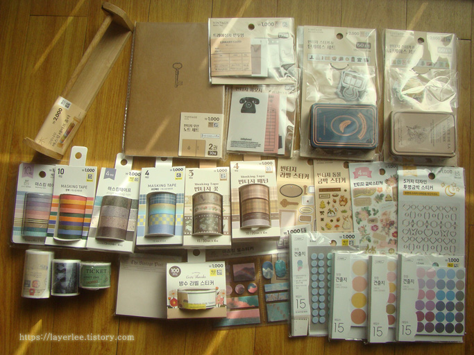 마스킹테이프와 스티커가 중심입니다. 개별 포장을 뜯기 전이에요.