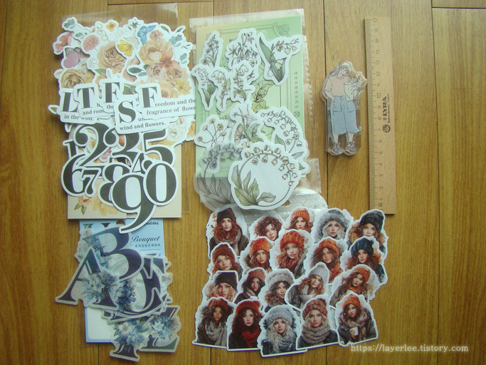 큼직한 꽃 5매, 레터링 5매, 숫자 10매 총 20매의 화지 스티커, 화지와 얇은 트레싱지 두 가지 재질로 1매씩 10가지 디자인의 총 20매 스티커, 꽃을 든 인물 아크릴 집게, A~Z까지 26매의 화지 스티커 그리고 아트지 20매 인물 스티커입니다.