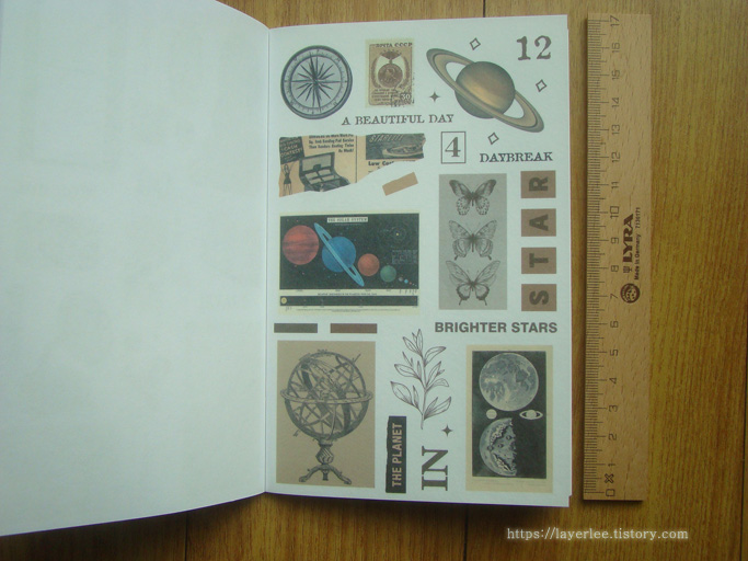 총 20매의 칼선이 없는 화지 스티커북입니다. 중간의 우주 관련 페이지를 펼쳐 찍었어요.