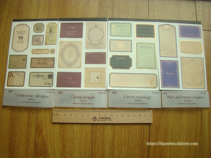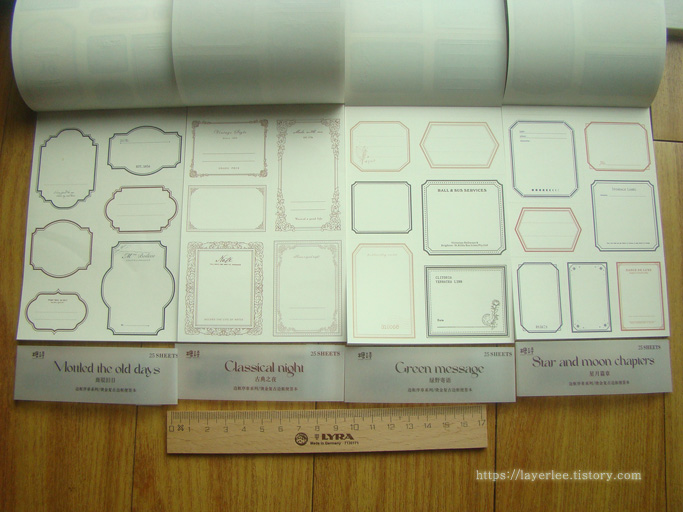왼쪽 둘은 4디자인 5매씩 총 20매 5단 화지 스티커북이고 오른쪽 둘은 30매짜리 뜯어쓰는 메모지입니다.