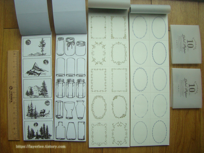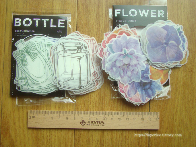 스티커북은 숲 2가지, 우표 2가지 디자인으로 된 것과 작은 유리병 2가지 큰 유리병 2가지 디자인인 것을 구매했어요.