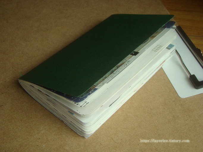 짙은 녹색 표지의 미니 수첩입니다. 꽤 부풀어서 위를 눌러두지 않으면 이렇게 뜹니다.