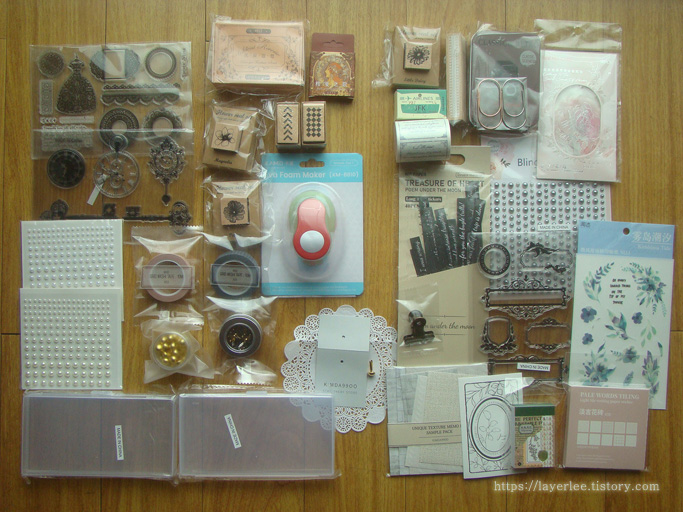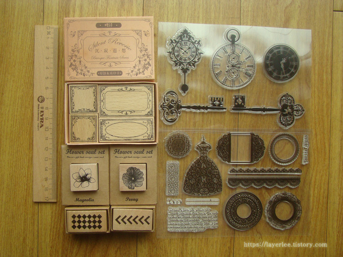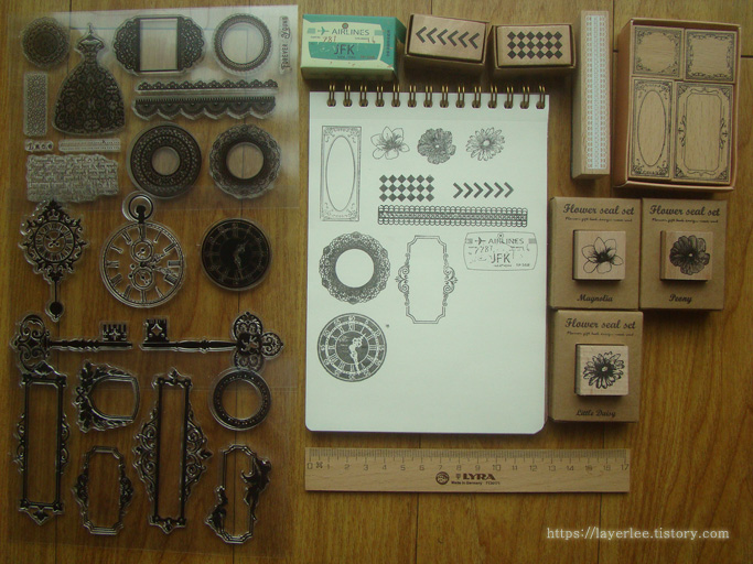 덤으로 받은 프레임 스탬프와 긴 레이스 스탬프 그리고 빈티지 티켓 스탬프도 찍고 스탬프 전부를 모아 촬영했습니다.
