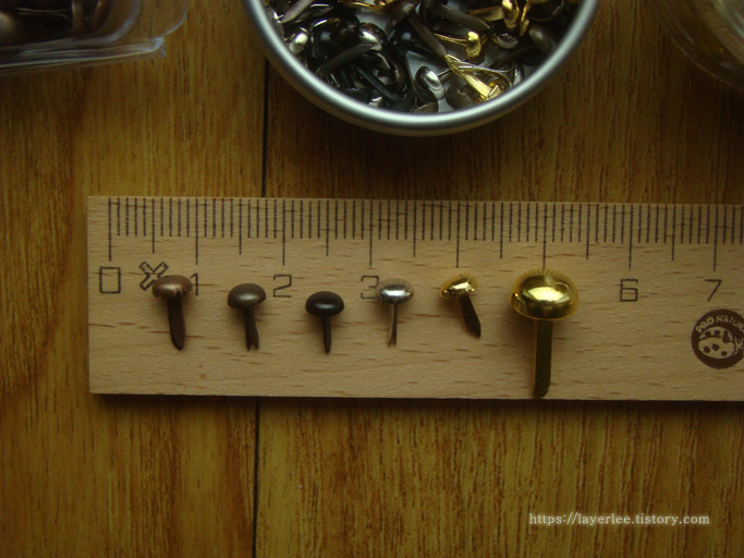 아래 자 위에 색상별로 하나씩 놓아봤어요. 레드 브론즈, 브론즈, 블랙, 실버, 골드 그리고 골드 대형입니다.