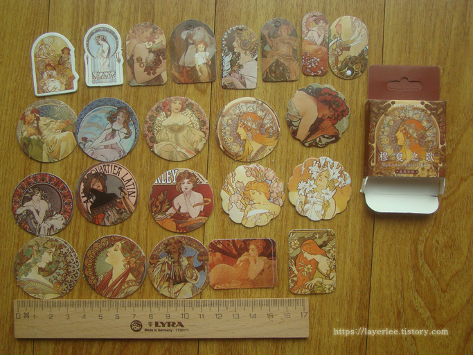 무하의 그림 23종 2매씩 총 46매짜리 미니 스티커입니다. 위의 것은 태그용으로 펀칭된 것도 있어요.
