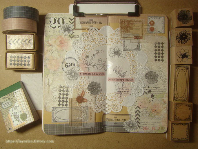 바탕 배경지와 날짜, 레터링은 가지고 있던 거고 중앙의 도일리부터 모두 오늘 온 김닥구의 포장용품과 구매품 그리고 덤을 활용하였습니다.