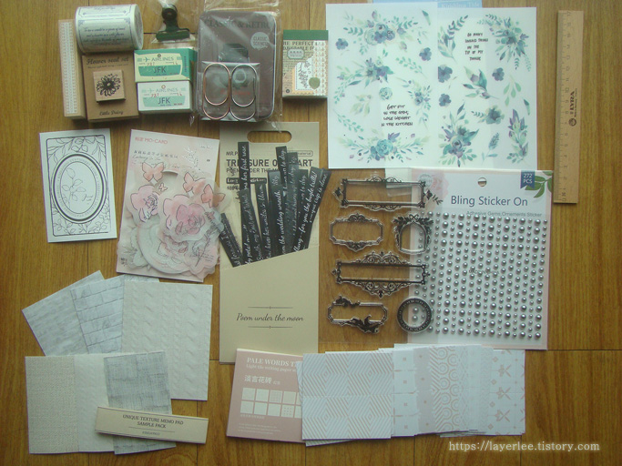 왼쪽 위부터 긴 레이스 스탬프, 푸른색 레터링 마테, 미니 꽃 스탬프 리틀데이지, 미니 집게 앤틱 색상, 빈티지 티켓 스탬프, 미니 틴케이스, 빅사이즈 클립 2가지 색상, 화지 미니북, 푸른꽃 전사 스티커 2매, 김닥구 자체 제작 스티커, 은박 분홍꽃 스티커 10디자인 3매(PET2매, 트레싱지1매), 김닥구 자체제작 메모지 3종 10매씩, 스티커 3종 1매씩, 검정과 PET 2종 레터링 40매, 프레임 클리어 스탬프, 그레이색 반진주 스티커 3사이즈 272개 그리고 파스텔 컬러 타일 스티커 10종 3매씩 30매입니다.