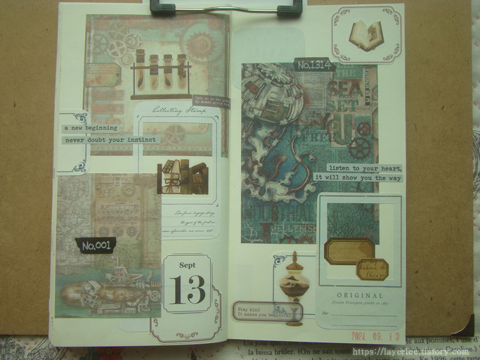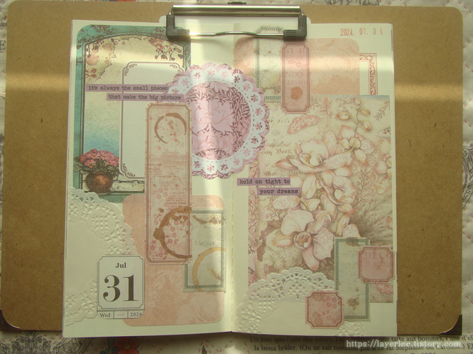 비슷한 배경지를 다른 위치로 찢어 그 틈이 이어지도록 배치하고 비슷하지만 다르게 대칭이 되도록 이것저것 배치했어요.