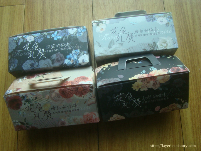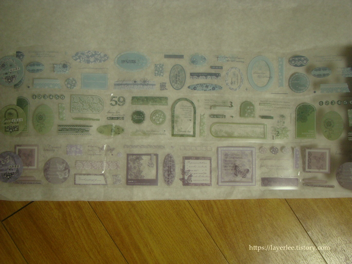 그림이 꽉 찬 5센티 마테와 레터링과 꽃이 있는 마테 구성입니다. 둘 다 PET인데 위의 마테가 더 얇아요.