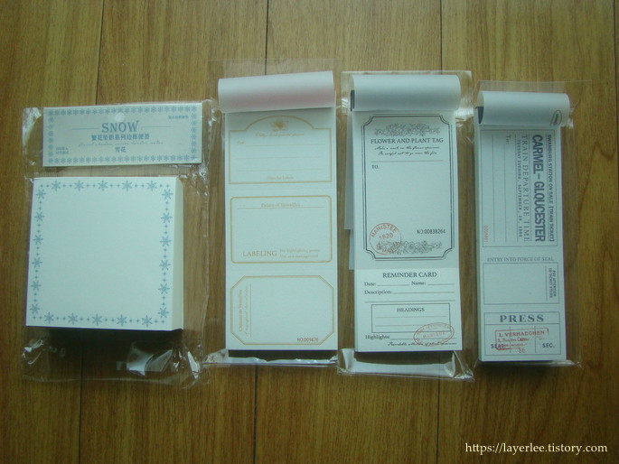 폭과 길이가 각각 6 X 14, 5.5 X 14, 4.5 X 13.5 센티입니다. 오른쪽 티켓 메모지는 바탕색이 살짝 회청색이에요.